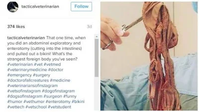 He posted the picture with the caption: “That one time, when you did an abdominal exploratory and enterotomy (cutting into the intestines) and pulled out a bikini! What’s the strangest foreign body you’ve seen? #veterinarian #vet#vetmed #veterianarymedicine #doctor #emergency #surgery#doctorfallcreatures #medicine”Nawa o!